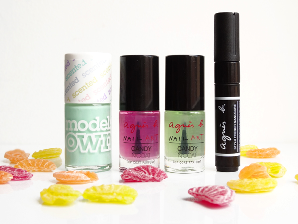 Pour ma première, j'ai jeté mon dévolu sur un vernis assez original en soi puisqu'il est parfumé. Il s'agit du Apple Pie issu de la collection Fruit Pastel de Models Own. Autre nouveauté, dans la même thématique, que j'ai envie de te faire découvrir : le top coat parfumé signé Agnès b. J'ai en effet en ma possession les plutôt gourmands Candy N'Coat de la marque qui, eux aussi, dégagent un parfum sucré une fois appliqués sur les ongles. Enfin, le sucre appelant le sucre, j'ai eu envie de tester le Stylo French Manucure d'Agnès b. pour me créer un petit effet berlingot (ou un truc dans le genre) sur les ongles. Slurp !