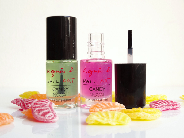 Du coup, pour le fun, je n'ai pas pu m'empêcher de ranimer la flamme (enfin, le côté sucré de la chose) à coups de top coat parfumé. En effet, Agnès b. a sorti 2 nouveaux top coats qui, une fois secs sur les ongles, dégagent une odeur fruitée. Il s'agit des Candy N'Coat.