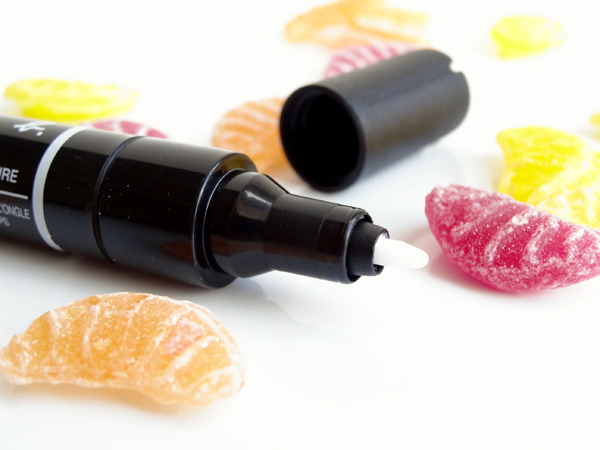 Enfin, histoire d'être dans le sucre jusqu'au cou, je n'ai pas pu m'empêcher de tester le Stylo French Manucure Agnès b. C'est la 1ère fois que je teste ce genre de bidule et je suis plutôt agréablement surprise. Après avoir secoué le truc dans tous les sens, la pointe de la mine en plastique dur du stylo (d'environ 1 mm de largeur) fait sortir du vernis blanc en son milieu de façon suffisamment précise pour dessiner des zigouigouis sur ses ongles.