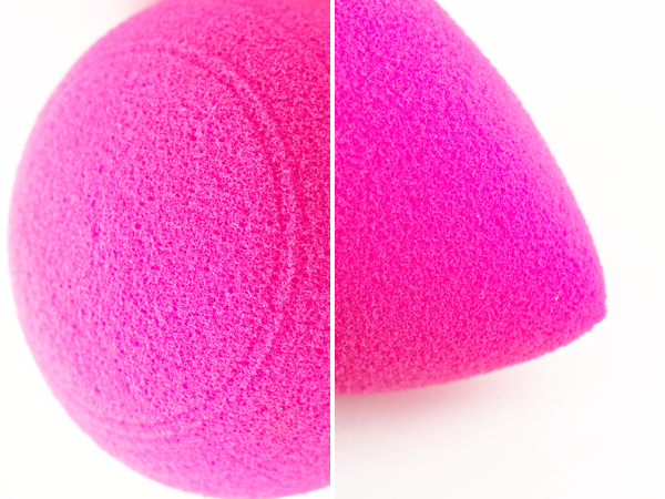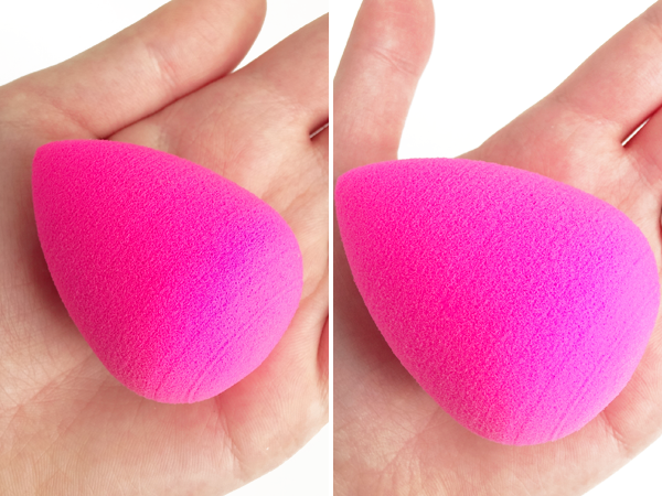| A gauche : Beauty Blender sec | A droite : Beauty Blender humidifié, essoré et gonflé |
